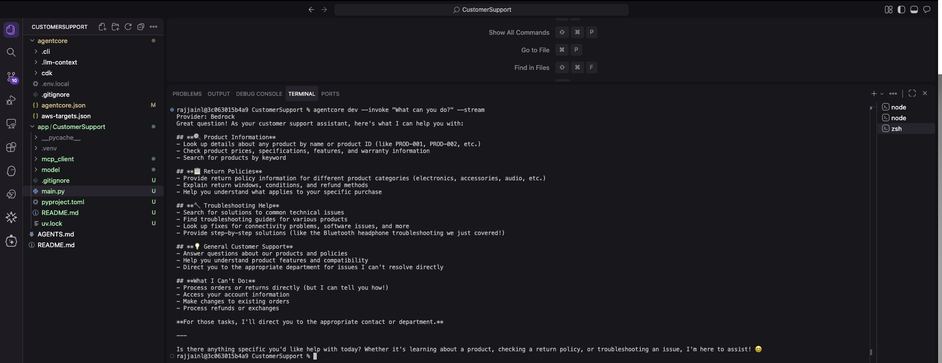 1. 搭建了项目框架 — 创建了包含 agentcore/(配置 + CDK)和 app/(agent 代码)的目录结构