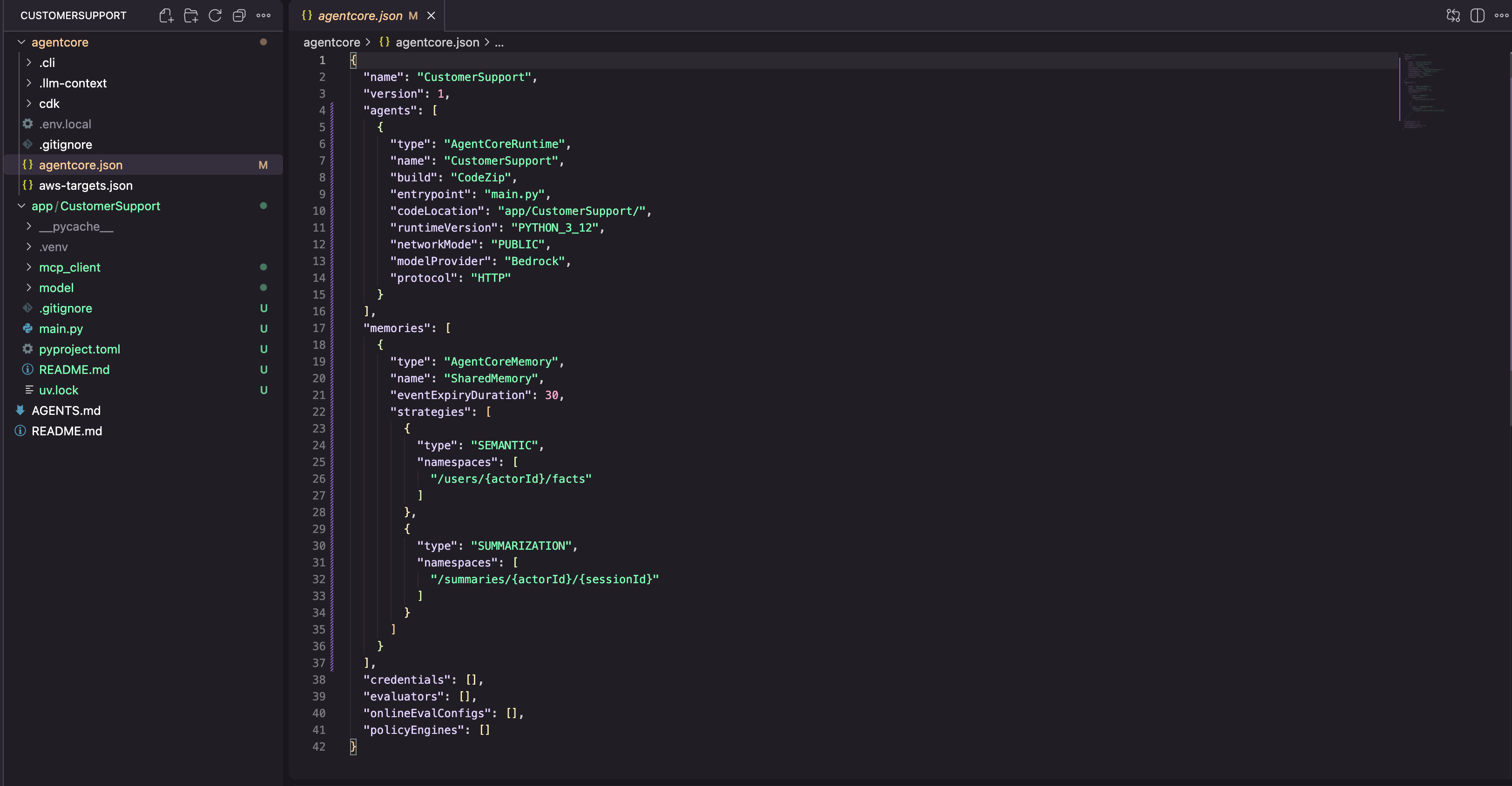 这将使用记忆配置更新我们的 agentcore/agentcore.json。我们可以验证: