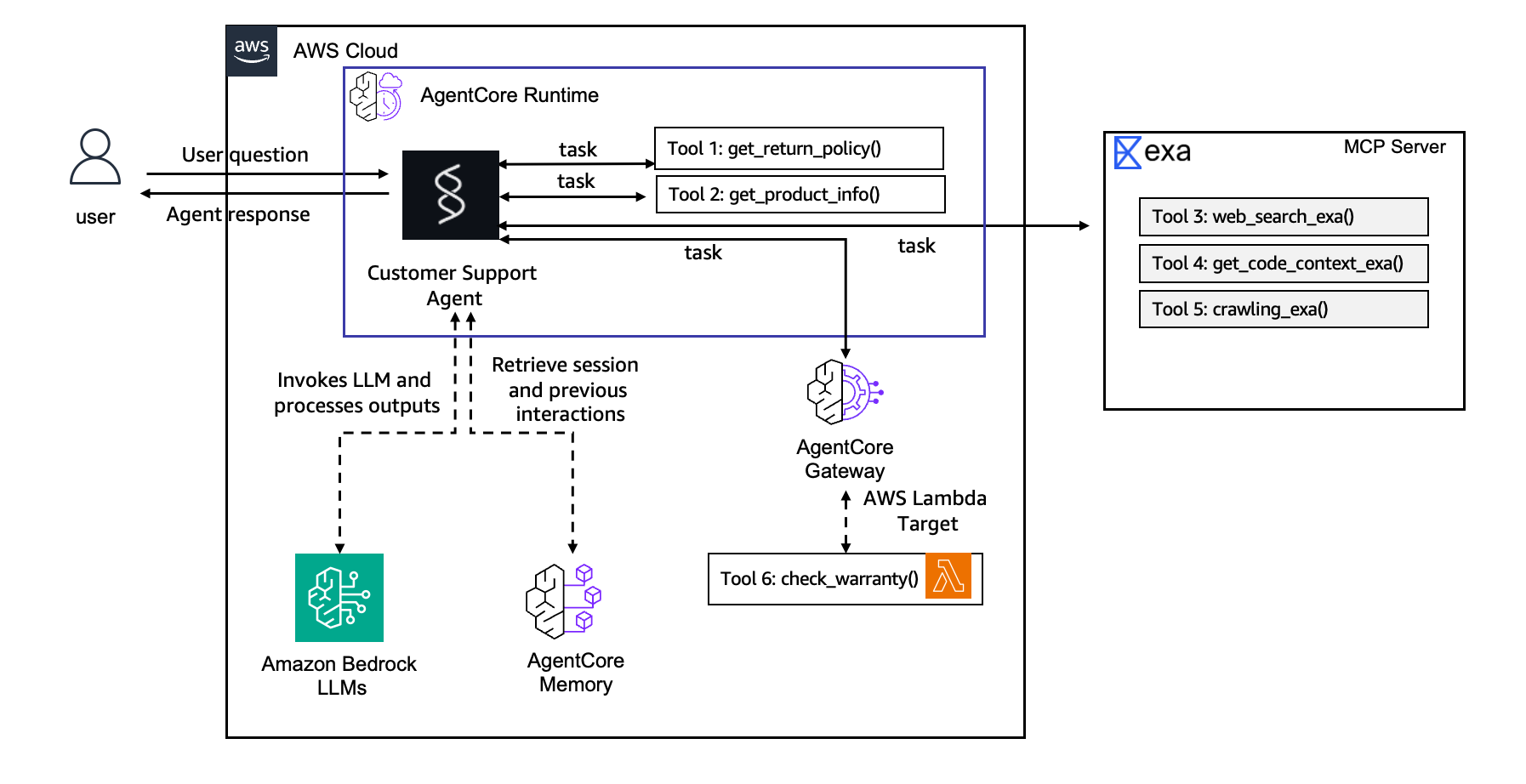 本地工具(get_return_policy、get_product_info)保留在 agent 代码中。Gateway 工具(check_warranty)在运行时通过 MCP 客户端自动发现。